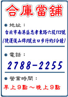 - 本合庫當舖以動產為擔保之質借放款業務,免向親友低頭,高額低息快速撥款,南港區當舖典當服務有口碑,以較低之利率,提供民眾短期融資之管道。